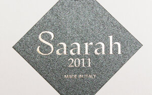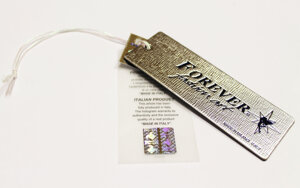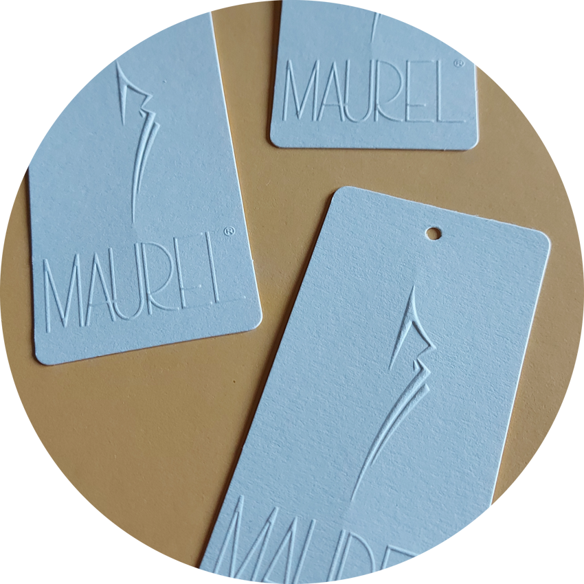 cartellini in cartone metallizzato accoppiato gr 350 + 350, con lavorazione di stampa a caldo, stampa litografica e serigrafica in rilievo, fustellati con angoli arrotondati e foro.
