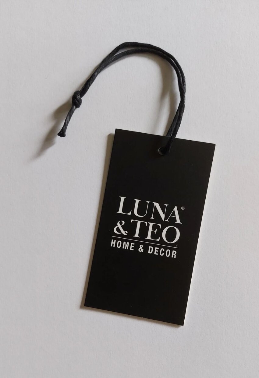 Cartellini in cartone accoppiato gr 350 + 350, con lavorazione di stampa a caldo . Abbinati a etichette tessute con stessa grafica in alta definizione.