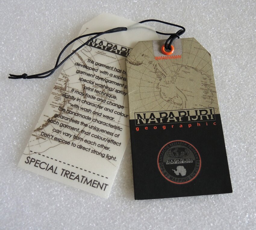 cartellini stampati in litografia abbinati con cordoncino di cotone naturale a libretto con storia del brand e spiegazioni prodotto in decine di pagine